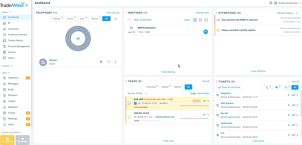 TraderWind Dealing room CRM empowers all stakeholders to achieve higher hit ratios, reduce risks, and enhance customer satisfaction and retention. This is achieved through improving dealer-client interactions and providing sales teams with the tools to identify and capitalize on market opportunities.
