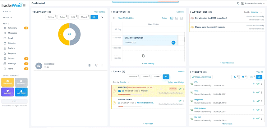 At the core of our offerings lies TraderWind CRM, a solution meticulously crafted for dealing rooms. Seamlessly integrating with disparate systems, TraderWind enhances dealing room performance and efficiency. From a unified dashboard driven by deep BI analytics to productivity modules and beyond, TraderWind empowers dealers and managers to make informed decisions, bolster regulatory compliance, and elevate overall trading performance through enhanced customer interaction.